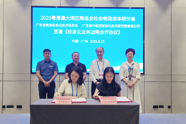 广东省物流标准化技术委员会与广东省中绍宣标准化技术研究院有限公司签署《标准化业务战略合作协议》发表时间:2025-08-23 10:03 8月22日,广东省物流行业协会主办了“2025粤港澳大湾区降低全社会物流成本研讨会”。会上,在广东省物流标准化技术委员会(GD/TC4)秘书长马仁洪、广东省物流行业协会书记梁玉霞、粤港澳大湾区物流产业联盟执行主席谢诚杰、佛山市供应链物流协会会长段玉以及与会嘉宾的共同见证下,广东省物流标准化技术委员会委员胡秘与广东省中绍宣标准化技术研究院有限公司广东省分公司总经理蓝东兰签署《标准化业务战略合作协议》。 根据协议内容,广东省物流标准化技术委员会将与广东省中绍宣标准化技术研究院有限公司在标准研制、标准宣贯、标准评估等方面开展全方位合作。 双方将充分发挥各自在行业资源、技术研究、标准制定与推广应用等方面的优势,共同推动粤港澳大湾区物流标准体系的完善,促进物流行业高质量发展。